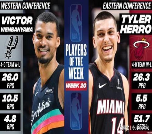 今日,NBA官方公布了第20周东西部周最佳球员名单,结果显示东部属于热火后卫泰勒希罗,西部则由马刺中锋文班亚马当选。上周,希罗场均得到26.3分5.5篮板,三分命中率高达51.7%,帮助热火取得4胜0负的佳绩;文班亚马场均贡献26.0分10.5篮板4.8盖帽,率领马刺四战全胜。从个人数据和球队战绩来看,两人的当选实至名归,但也有不少球迷对湖人球星卢卡东契奇的落选感到忿忿不平。
