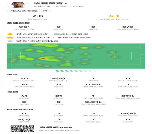 体育播报3月11日宣 欧冠1/8决赛首回合,利物浦客场0-1不敌加拉塔萨雷。埃基蒂克本场首发出战,2次射门1次射正,5次过人成功,送出1次关键传球,1次错失进球机会,评分7.6。