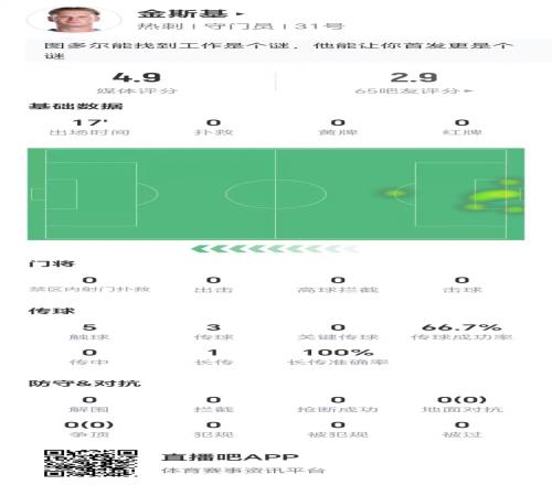 技术统计数据显示,金斯基本场比赛零扑救,多项数据挂零,仅有5次触球,获评4.9分。