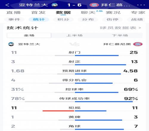 体育播报3月11日宣 在本轮欧冠淘汰赛,拜仁6-1击败亚特兰大,以下为双方全场数据对比: