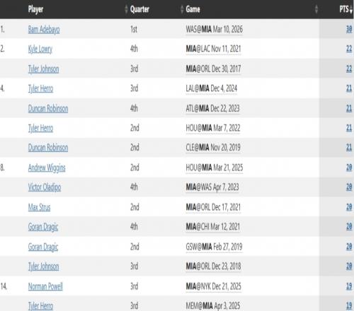 热火队史球员单节得分榜: