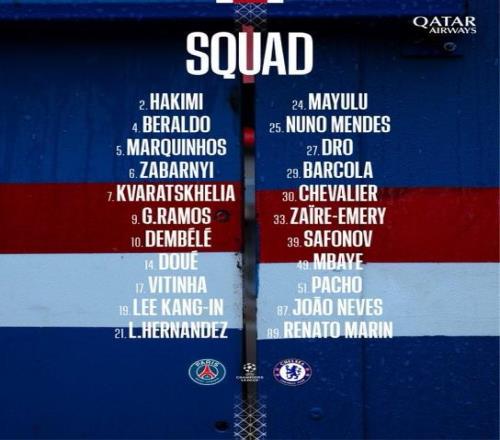 巴黎对阵切尔西大名单:
