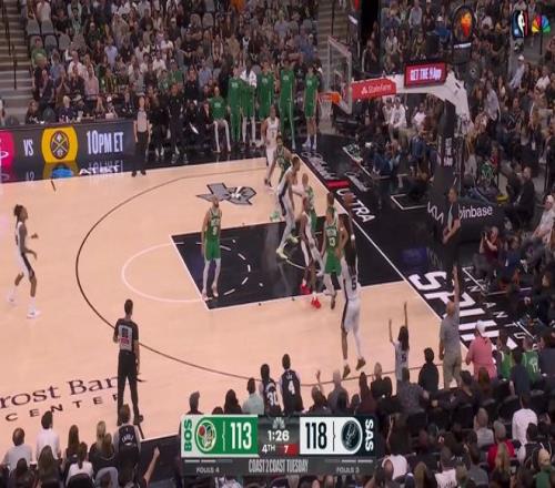 ——剩下41秒前,还是与文班亚马挡拆,强突凯尔特人三人防线,上篮打进,还造成犯规(加罚没进),这一球可以说杀死了比赛