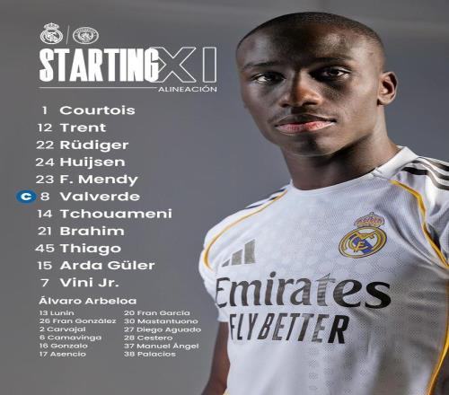 皇马首发:1-库尔图瓦、12-阿诺德、22-吕迪格、24-赫伊森、23-费兰-门迪、8-巴尔韦德、14-楚阿梅尼、21-卜拉欣-迪亚斯、45-皮塔奇、15-居莱尔、7-维尼修斯