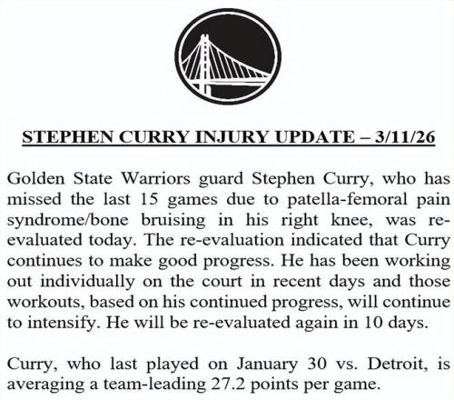北京时间3月12日,勇士官方宣布,库里因右膝髌股疼痛综合征/骨挫伤已连续缺席15场比赛,今日他接受了复查。复查结果显示,库里的康复进展良好。近期他已在场上进行个人训练,且基于目前的恢复情况,训练强度将逐步提升。他将在10天后再次接受复查。库里上一次出战是1月31日对阵活塞的比赛,本赛季他以场均27.2分领跑全队得分榜。