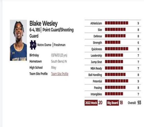 印第安纳州是美国知名的篮球之州,只要能在这打出名堂就意味着篮球前景一片光明,当年印第安纳州的最强篮球高中生是杰登-艾维,韦斯利高中毕业综合评分84分四星高中生,在全美排名第87,后卫位置第30,在这阶段声望一般,而且因为口罩问题爆发,他错过了许多学校的考察机会,最终选择了圣母大学.