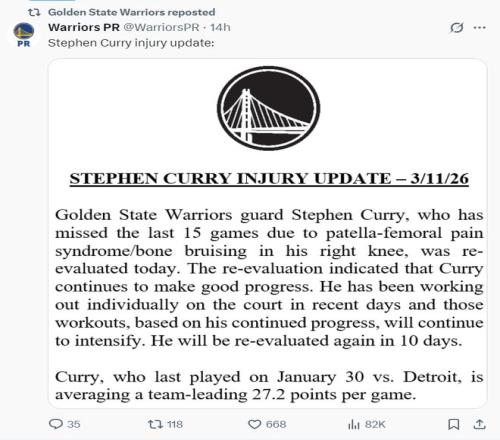 根据勇士官方的说法,库里因为右膝髌股疼痛综合征/骨挫伤已连续缺席15场比赛,球队对他进行了新的评估。评估结果显示库里的恢复取得了进展但还没有达到回归赛场的要求,他将在10天后再度评估。