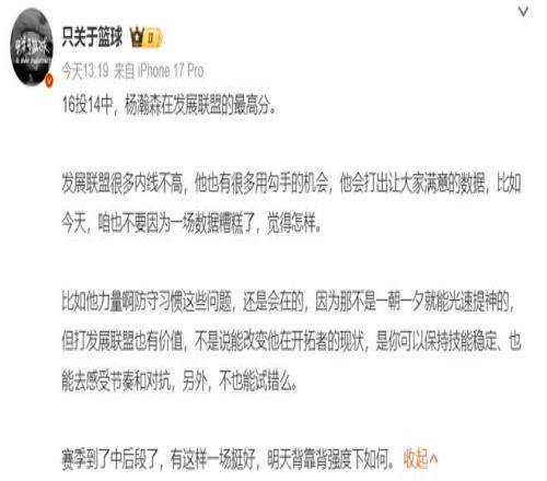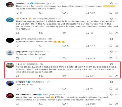 但有一位开拓者球迷写道:没用的,就算杨瀚森在G联赛拿到100分也没用,因为开拓者主帅斯普利特是一个低智商、愚蠢的主帅,他不会给杨瀚森机会的。