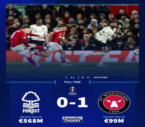 德国转会市场列出了两队阵容身价,诺丁汉森林阵容总身价5.68亿欧元,中日德兰阵容总身价仅9900万欧元。