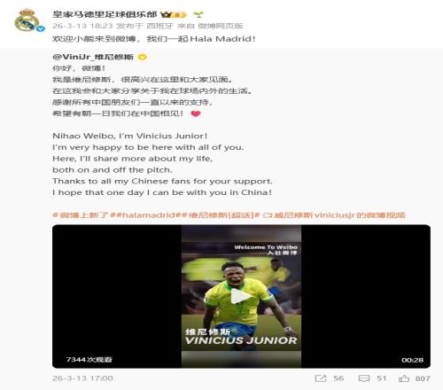 维尼修斯时隔近五年重启微博,感谢中国球迷支持,皇马官方转发