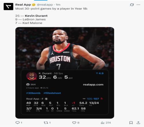 在生涯第18个赛季拿到25次30+的球员杜兰特历史第一,詹姆斯只有9次,卡尔马龙只有7次。