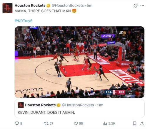 休媒:火箭队球迷又看着37岁的杜兰特拯救了球队,他再一次成为了救世主。