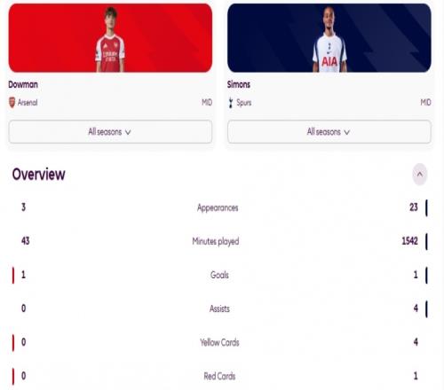道曼本赛季只用了43分钟便打进英超首球,热刺新援哈维·西蒙斯也只有一个英超进球,但他已踢了23场出战1542分钟。