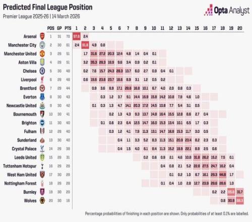 Opta超级计算机预测的最新夺冠概率方面,阿森纳夺冠概率高达97.6%,而曼城的夺冠概率仅为2.43%。