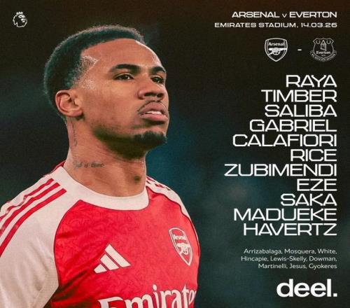 阿森纳首发:1-戴维-拉亚、12-廷贝尔、2-萨利巴、6-加布里埃尔、33-卡拉菲奥里、41-赖斯、36-苏比门迪、10-埃泽、7-萨卡、20-马杜埃凯、29-哈弗茨