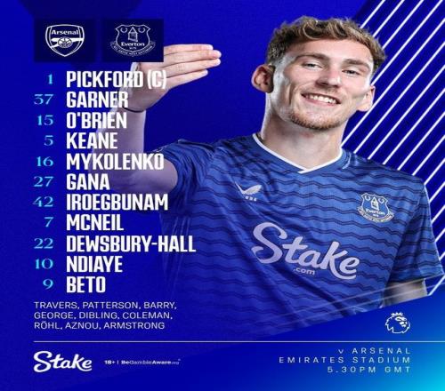 埃弗顿首发:1-皮克福德、37-詹姆斯-加纳、15-杰克-奥布赖恩、5-迈克尔-基恩、16-米科连科、27-伊德里萨-盖伊、42-伊罗格布南、7-麦克尼尔、22-迪尤斯伯里-霍尔、10-恩迪亚耶、9-贝托