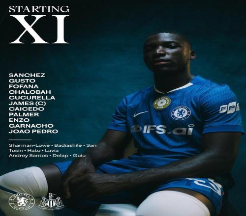 切尔西首发:1-桑切斯、27-古斯托、29-福法纳、24-詹姆斯、23-查洛巴、3-库库雷利亚、25-凯塞多、8-恩佐、10-帕尔默、49-加纳乔、20-佩德罗