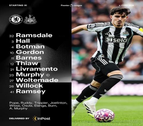 纽卡首发:32-拉姆斯代尔、3-霍尔、12-佳夫、4-博特曼、21-利夫拉门托、41-拉姆齐、28-威洛克、27-沃尔特马德、10-戈登、11-巴恩斯、23-墨菲