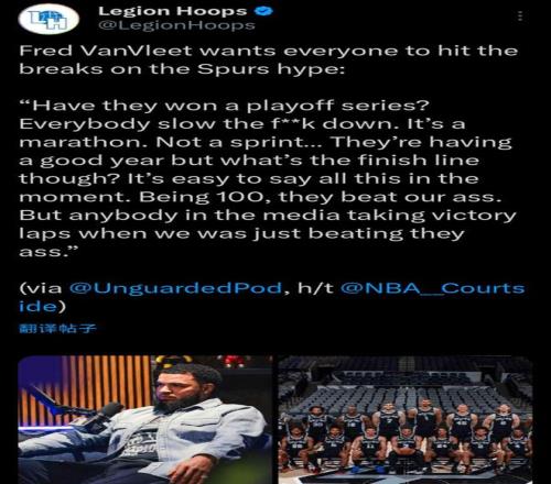 由于遭遇十字韧带撕裂大伤,范乔丹在养伤期间开启同名个人播客节目《Fred VanVleet》锐评联盟热点事件,本赛季状态火爆的马刺队自然成为其讨论的话题之一。