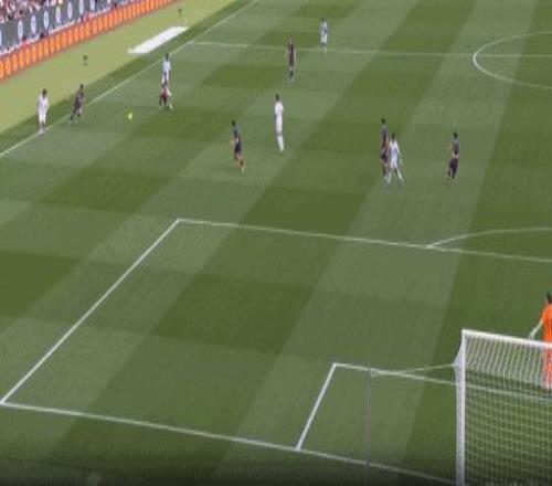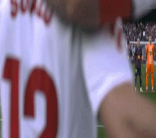 第45+3分钟,胡安卢-桑切斯传中,奥索端射破门扳回一球,塞维利亚1-3巴萨