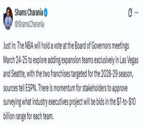 北京时间3月16日,据ESPN消息源透露,NBA将于下周举行董事会投票,正式探讨仅在拉斯维加斯和西雅图新增扩张球队,两支新球队计划在2028‑29赛季正式开始参赛。