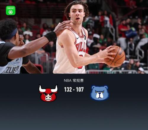 第四节公牛迪林厄姆拿下10分,灰熊杰伦-威尔斯拿下5分,最终公牛132-107战胜灰熊