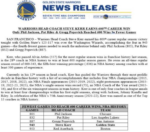 除此之外,科尔仅用943场比赛达成600胜,创造NBA历史第4快纪录。