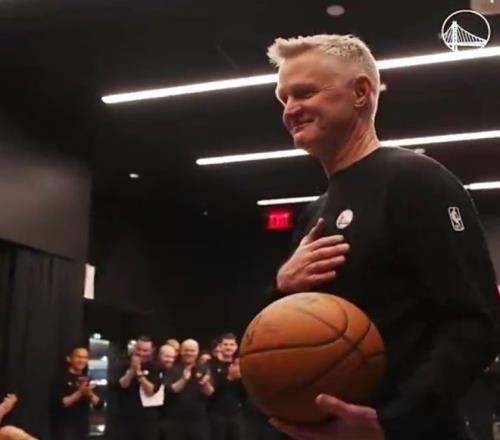 北京时间3月17日,伴随勇士125-117战胜奇才结束5连败,科尔成功达成执教生涯600胜里程碑,且只用943场比赛创造NBA历史第4快纪录。赛后,库里在更衣室击地传球“助攻”,将比赛用球送给科尔进行祝贺。