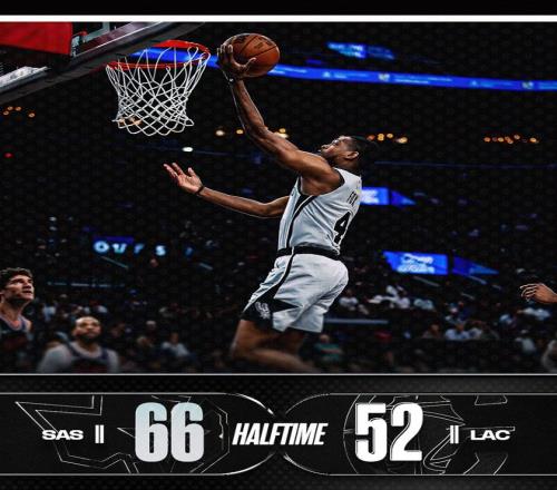 卡斯尔打3分开始第二节,之后又进两球,他率队打出12-0的反击波,马刺队以41-37反超。马瑟林和科林斯合取4分追平,文班亚马三分回应,约翰逊连进两球,马刺队又是一波11-2的小高潮,半场前5分钟时他们以52-43领先。快船队再叫暂停,科林斯勾手打进,瓦塞尔三分中的率队连拿6分,马刺队领先13分。加兰突破得分,两队各拿5分,文班亚马出手三分命中,半场结束时马刺队以66-52领先14分。