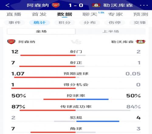 体育播报3月18日宣 本轮欧冠阿森纳对阵勒沃库森半场战罢,枪手1-0领先,以下为双方半场数据对比: