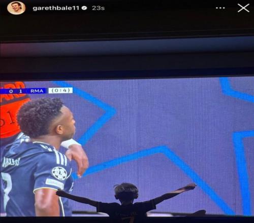 皇马名宿贝尔也在个人社媒晒出一张自己孩子在屏幕前与维尼修斯共同庆祝进球的照片。