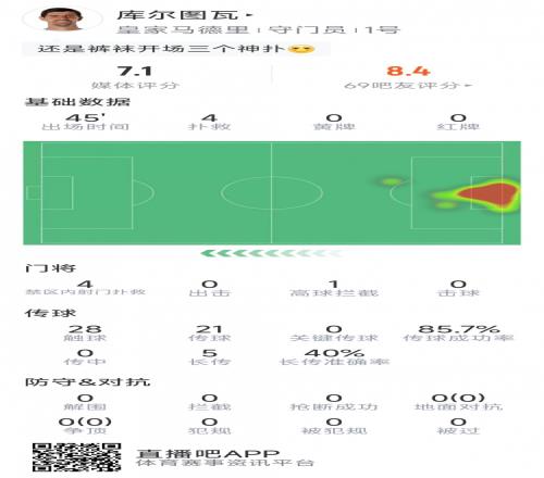 本场比赛库尔图瓦在上半场就完成4次扑救,28次触球,传球成功率86%,评分7.1分。