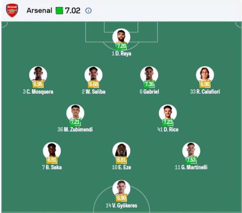根据机构预测,阿森纳将排出4-2-3-1阵型:门将拉亚;后防线由莫斯克拉、萨利巴、加布里埃尔和因卡皮耶组成;双后腰赖斯搭档苏比门迪;攻击线上萨卡、埃泽、马丁内利支援中锋哲凯赖什。梅里诺、厄德高、廷伯继续伤缺。