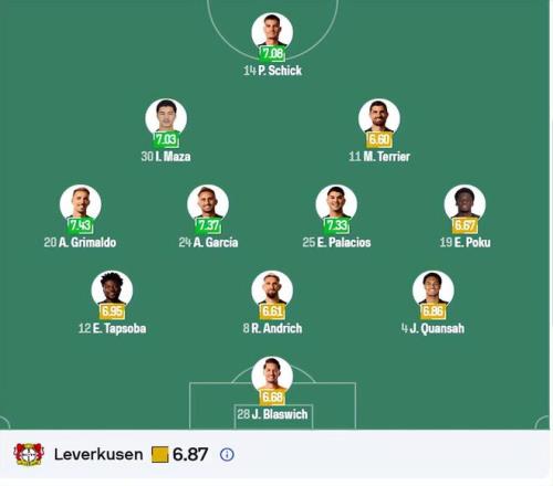 勒沃库森预计以3-4-2-1阵型应战:门将布拉斯维希;三中卫宽萨、安德里希、塔普索巴;中场波库、帕拉西奥斯、加西亚、格里马尔多;前腰蒂尔曼、马扎;前锋科法内。弗莱肯、塞吉尔、巴代、巴斯克斯、阿图尔等多名球员缺阵。