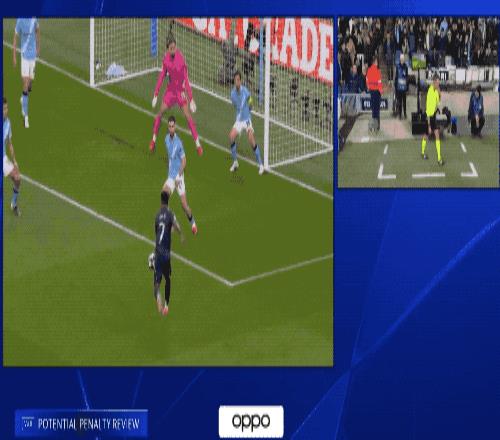 显示维尼修斯高速插上的射门击中立柱弹出,接下来,维尼修斯的射门被B席挡出。比赛进行了将近5分钟,蒂尔潘吹停,VAR介入,维尼修斯并不越位,B席门线上手球犯规,被红牌罚下,这才有了维尼修斯的点球。
