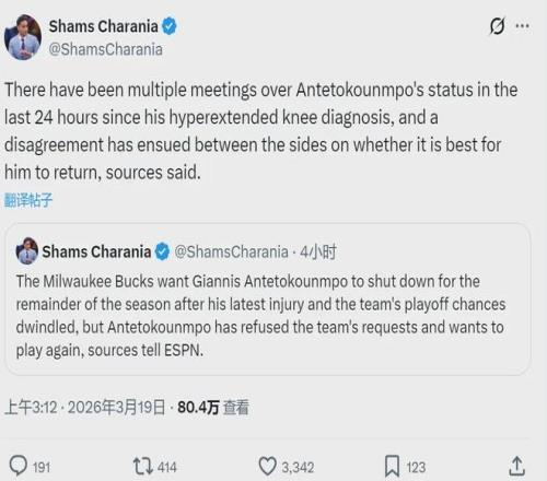 随后Shams在节目中表示:“字母哥遭遇左膝过度伸展和骨挫伤,一周后接受复查。这是他本赛季的第五次受伤,管理层希望他不要再打了。字母哥向雄鹿总经理霍斯特及工作人员明确表示,他不会选择赛季报销,本赛季一定要复出。”