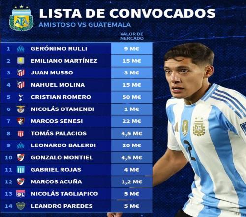 新一期阿根廷队身价榜:小蜘蛛、恩佐9000万欧第1,梅西1500万