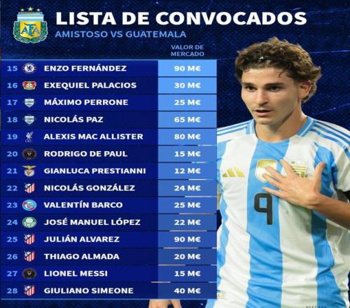 新一期阿根廷队身价榜:小蜘蛛、恩佐9000万欧第1,梅西1500万_24直播网