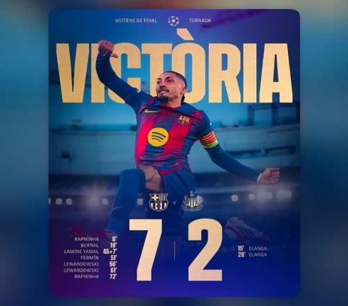 欧冠1/8决赛次回合,巴萨在诺坎普球场7-2大胜纽卡,总比分8-3淘汰喜鹊,杀进欧冠8强。拉菲尼亚独造5球,莱万梅开二...