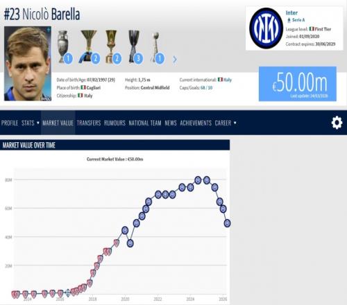 自2024年年底以来,巴雷拉的身价一路从生涯最高的8000万欧跌到7500万、6500万欧、6000万欧以及今天的5000万欧。目前巴雷拉的身价仍排在意大利籍球员第三,意甲球员第六,国米队内第三。