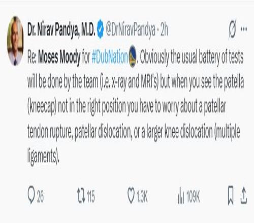 赛后他立马分析伤情:从穆迪受伤的瞬间来看,医疗团队会进行X光、MRI等检查,可以看到穆迪髌骨移位了,这可能意味着髌骨断裂、髌骨脱臼或者更严重的膝关节脱位(伴随多处韧带损伤)。
