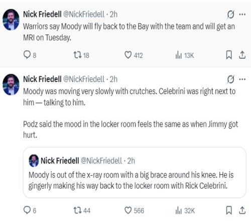 勇士记者尼克-费尔德透露,穆迪在接受完X光检查后,他已经开始拄拐一瘸一拐的行走,他跟里克-塞莱布里尼一起,他的左膝已经戴上厚厚的护具来固定。