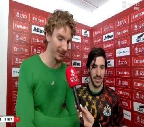 英格兰足总杯第4轮,纽卡客场3-1战胜维拉,进球的沃尔特马德和托纳利赛后接受了TNT体育的采访。谈比赛托纳利:我...