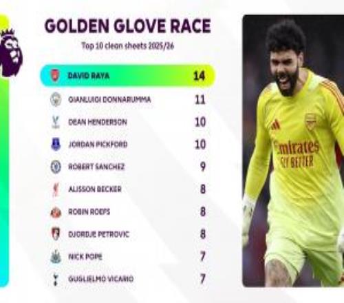 英超金手套排名:拉亚14场零封断层领跑,多纳鲁马11场居次席